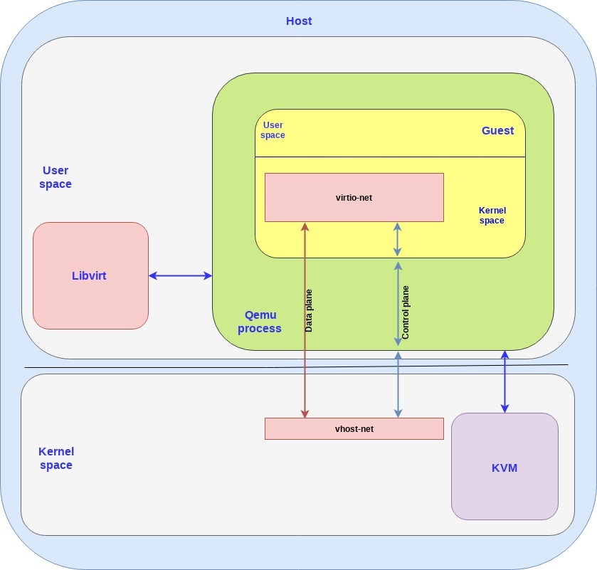 Virtio의 control plane은 Virtio의 spec에 따라 qemu process에 구현된다. 이와 반대로 data plane은 그렇지 않다. 그럼 왜 data plane은 qemu process에 구현하지 않는지 질문할 수 있다. 이유는 성능 때문이다.