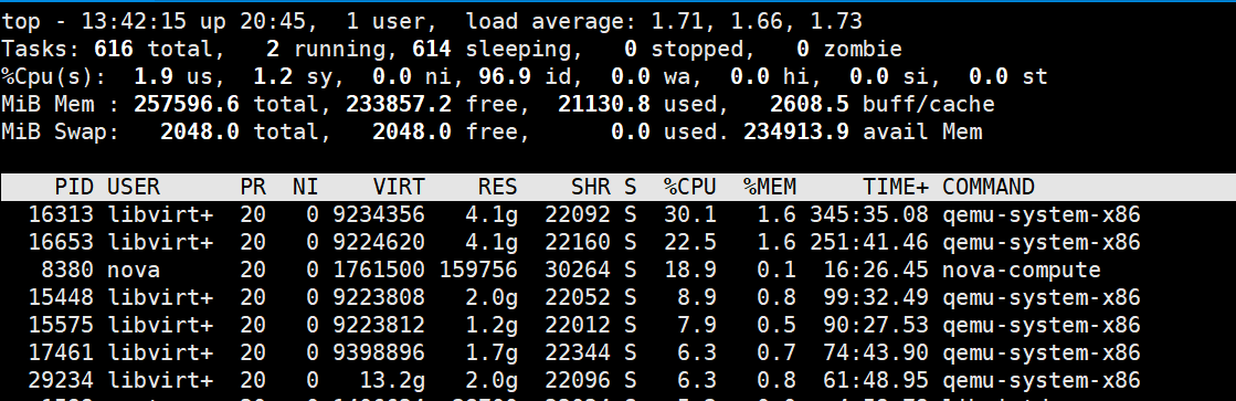 가상 머신을 만들고 top 명령을 수행해보면 아래 그림과 같은 결과를 얻을 수 있다. 아래 그림의 qemu-system-x86가 위 그림의 Qemu process에 해당한다.
