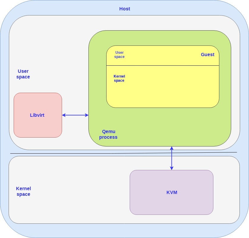 일반적으로 VM에 접근할 때 Libvirt를 통하여 Qemu process에 접근한다. 아래 그림은 하나의 Guest(VM)가 active 상태인 시스템 구성을 보여준다. KVM은 커널의 모듈로서 동작하기 때문에 Kernel space에서 동작하고, Libvirt와 Qemu process는 각각 하나의 User Process로 보기 때문에 유저 스페이스에서 동작한다. Qemu process는 하나의 VM을 담고 있다. 즉 N개의 VM을 생성하면 N개의 Qemu process가 생성되어 Libvirt와 통신한다.